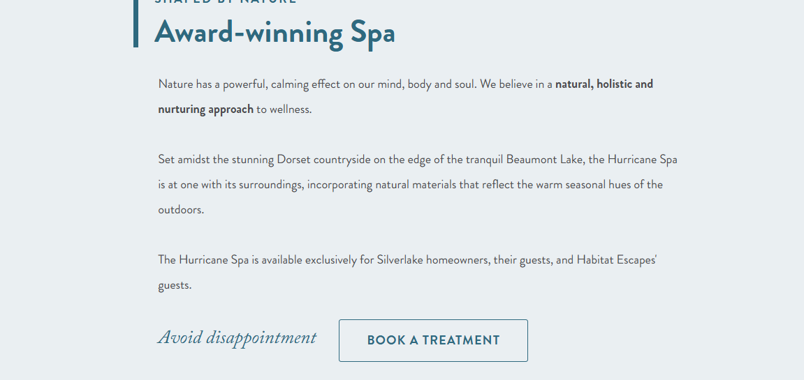 Please note: The Hurricane Spa is available exclusively for Silverlake homeowners, their guests, and Habitat Escapes' guests. Not all treatments are available for online booking. Certain specialised treatments such as pregnancy and heat treatments may require specific arrangements. For such services please contact us directly on 01305 819909 or use the booking form to email.