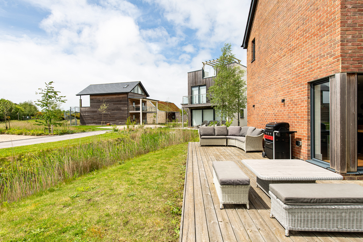 Step out from the dining area onto the decking that surrounds the property, providing space to relax by the stream. The property is equipped with a large outdoor sofa, dining table and a gas BBQ. There is also a gravel driveway next to the property.