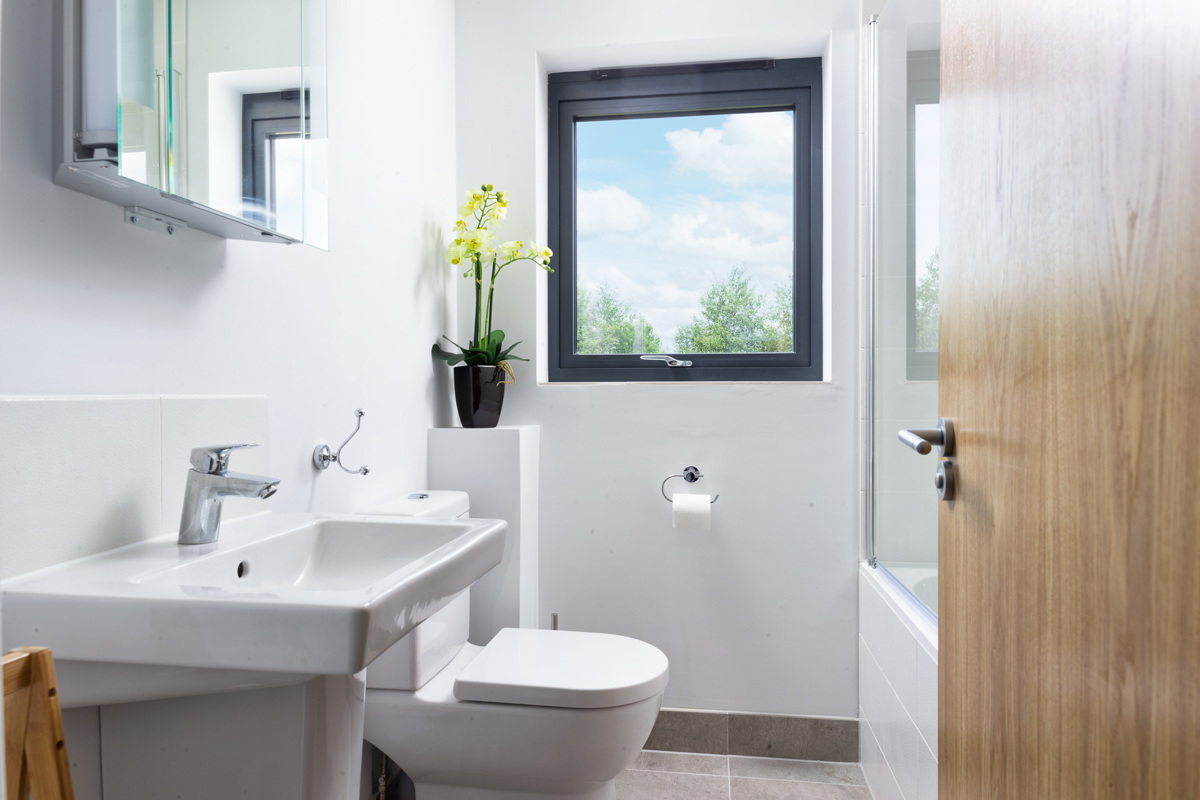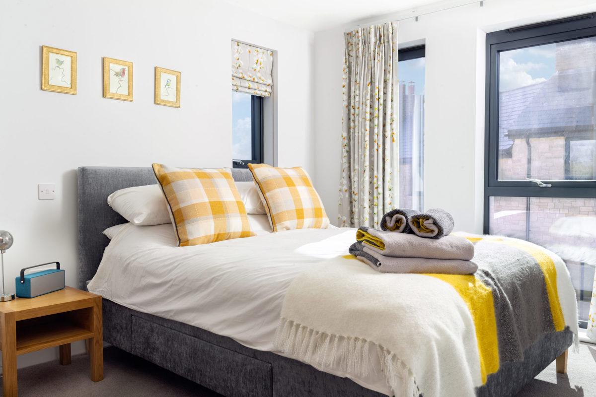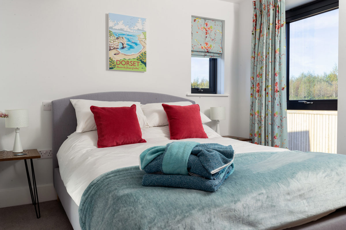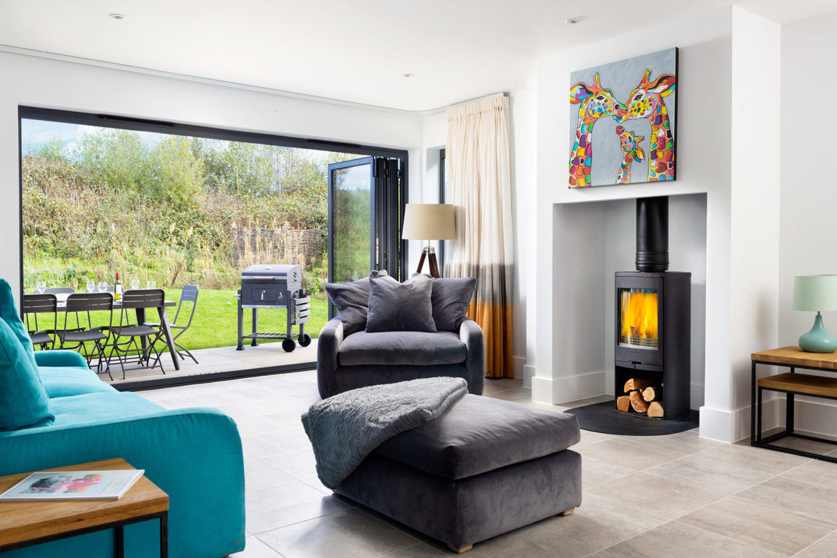 The generous ground floor accommodation is open plan with the living room having triple aspect windows, sumptuous sofas, bi-fold doors onto decking for the summer and a wood burning stove for the winter (local wood can be sourced from the estate). The house can comfortably accommodate eight adult guests to dine inside or out, depending on your mood. While the charcoal BBQ fires up you can enjoy a game of giant jenga, quoits or simply sit back and enjoy watching the wildlife – you can often see rabbits, dragonflies and bats in the evening.