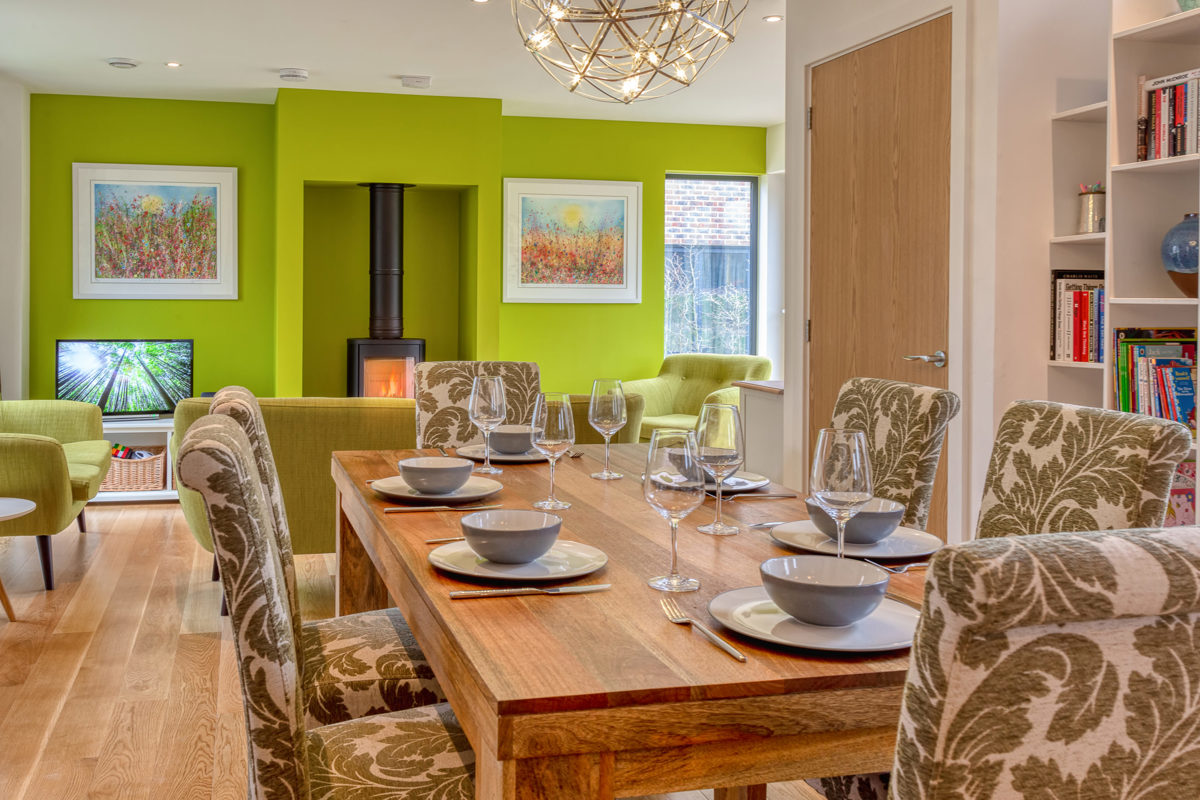 A bright and airy lounge with triple aspect windows host two settees and one armchair around a feature wood burning stove. Double glazed folding doors lead to a decked patio area. With the open plan design, the cosy lounge eases into the dining area where there is a dining table with seating for six.