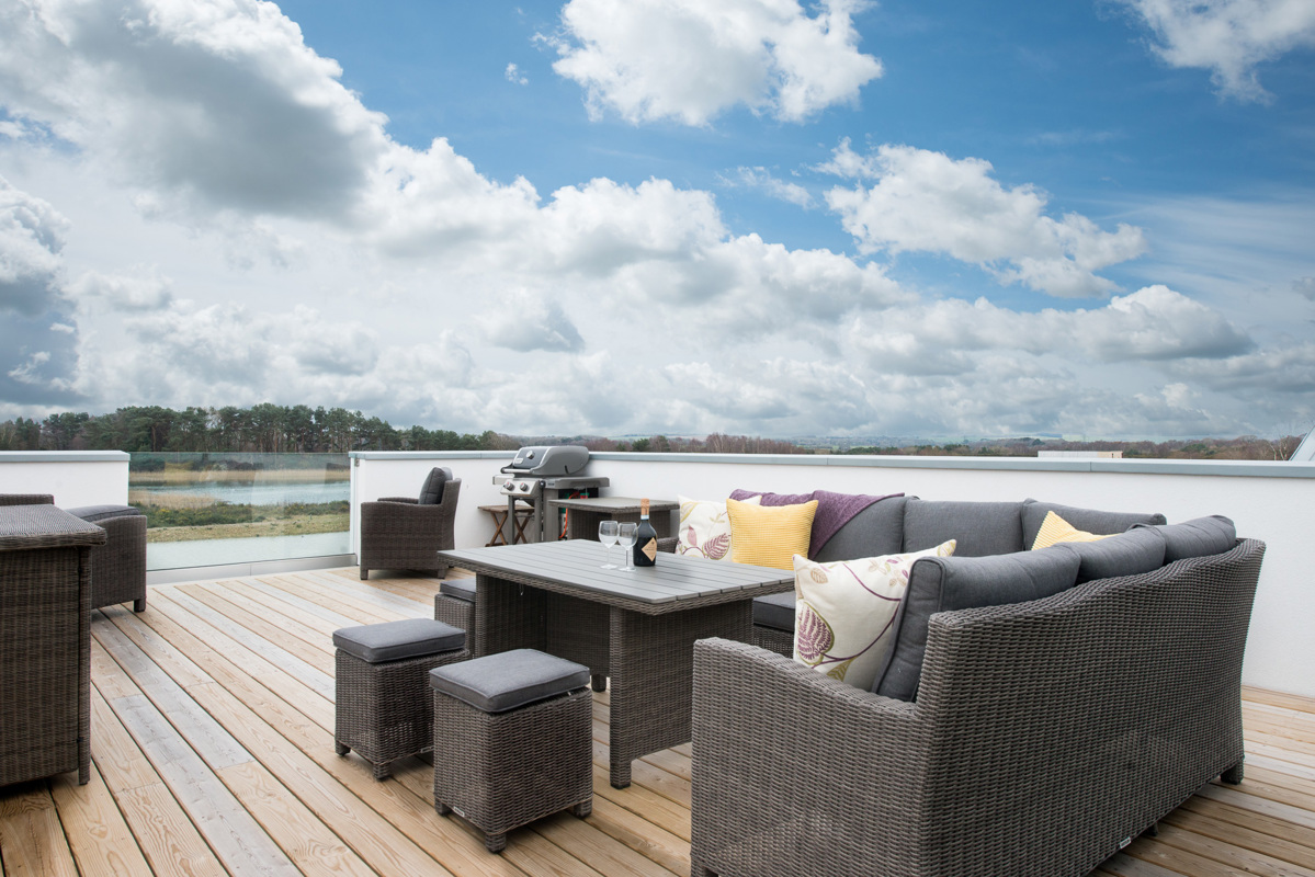 From the first floor there are stairs to the roof terrace with ample furniture for casual outdoor dining and views across all of the Estate and Nature Reserve. The roof terrace also benefits from a large gas BBQ.
