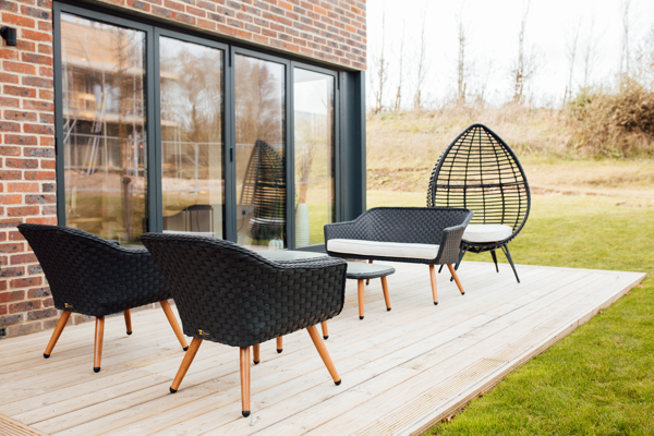 The decking to rear of the property accessed via sliding doors in lounge area, with charcoal BBQ and seating for 8 guests.
