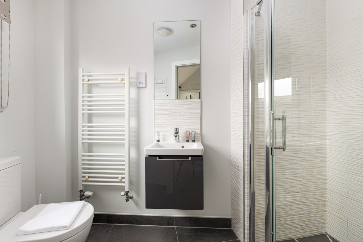 En-suite Shower Room: Walk in fully tiled shower, low level WC, wall mounted wash basin and drawer under, heated towel rail, shaver socket.