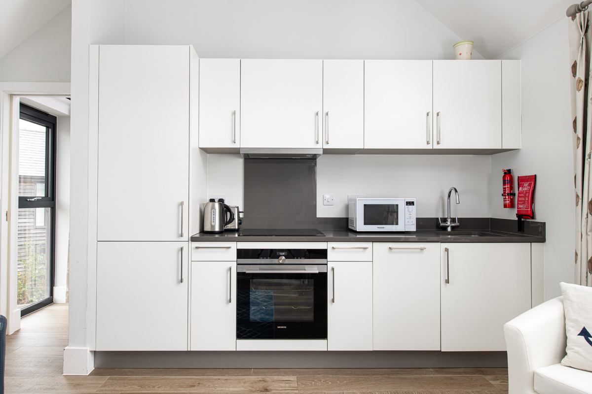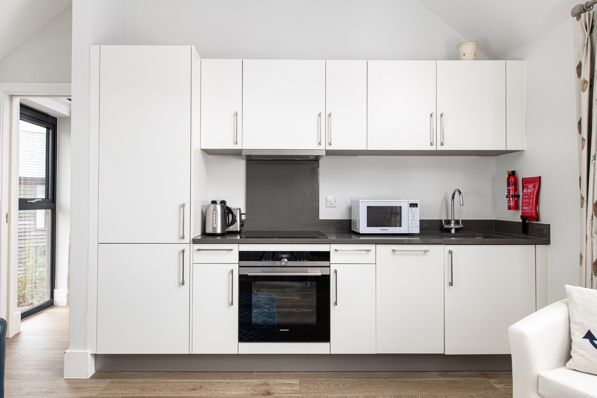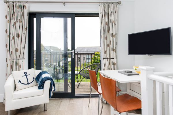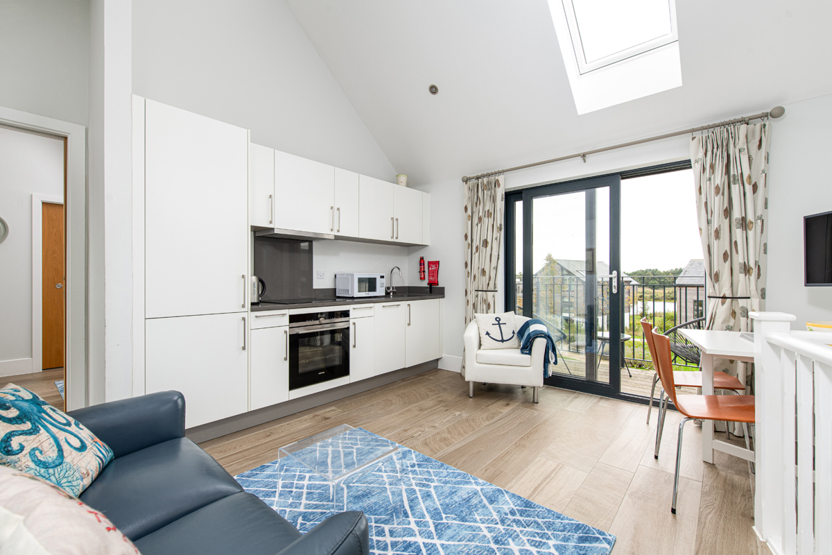 There is a two seater sofa and folding table with seating for 4 guests. Wall mounted Smart TV. Slide away patio doors provide access to the generous balcony giving an excellent view of Beaumont Lake along with the Pine Ridge and Dorset countryside beyond.