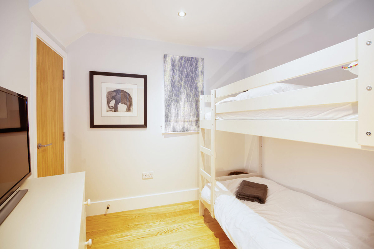 The property is accessed under the crescent archway to the front door and entrance lobby which leads to the first bedroom (kid’s room) consisting of bunk beds and a chest of drawers. There is also a fitted under stairs cupboard.