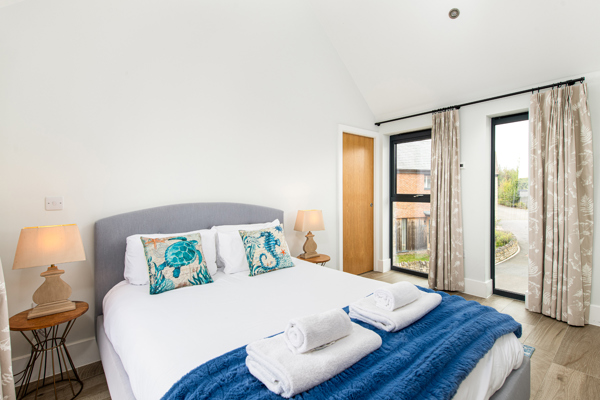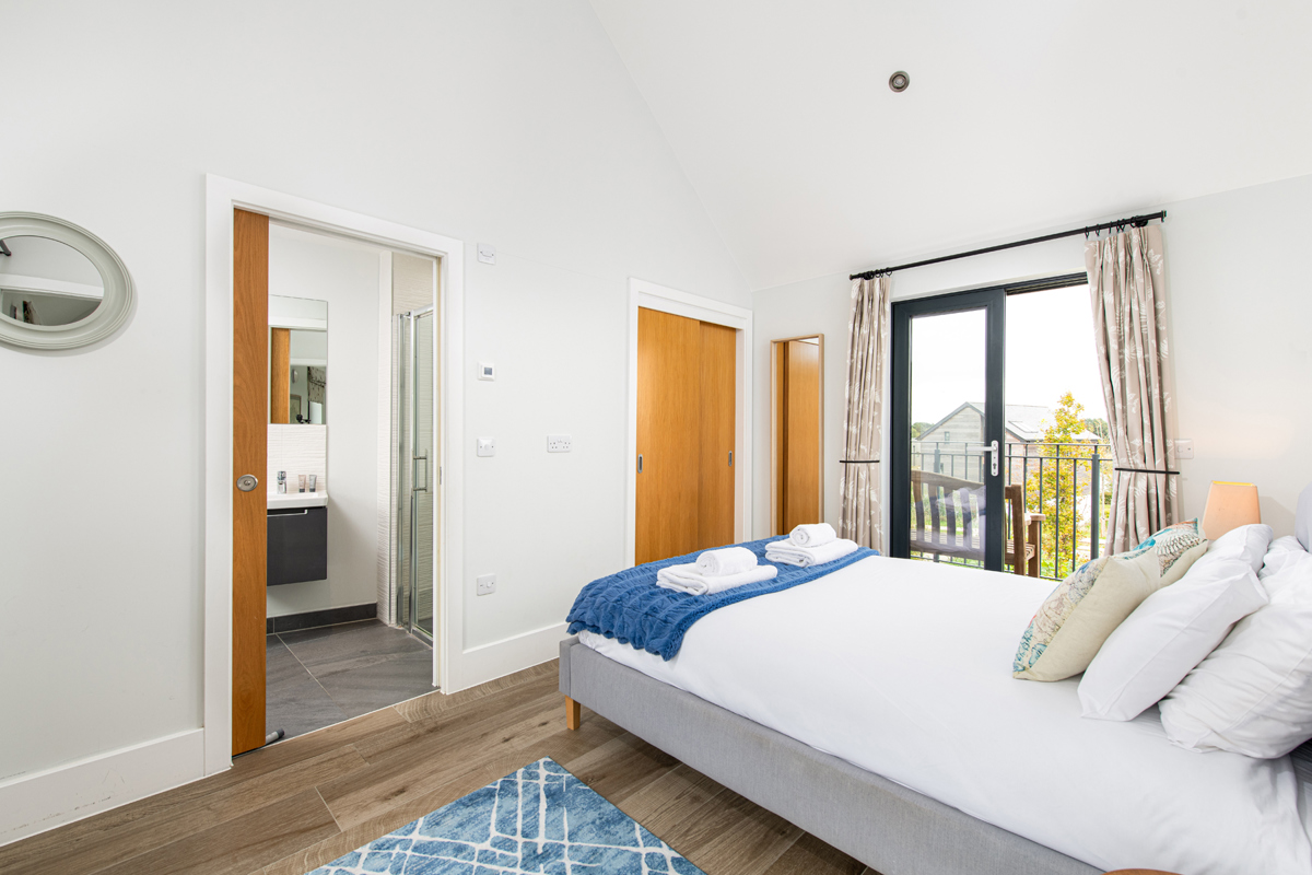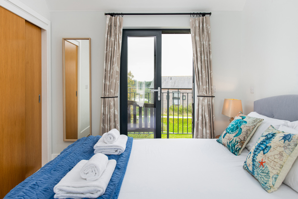 Through the living room is the master bedroom with a king size bed, side tables and table lamps. A luxury Tempur mattress has been provided to ensure guests' enjoy the best night's sleep. Fitted double wardrobe with sliding doors shelving and hanging rail. Similar slide away patio doors provide additional access to the balcony.
