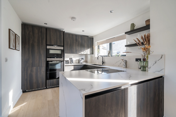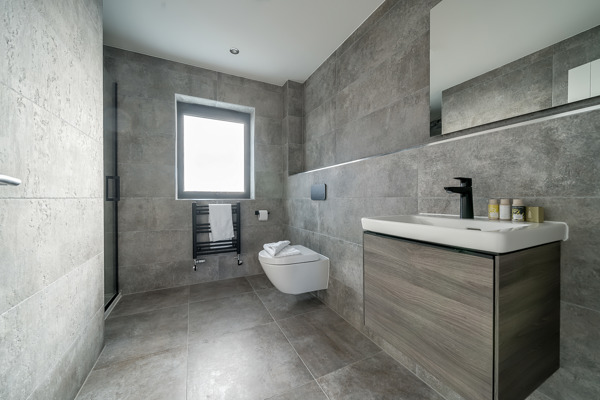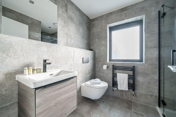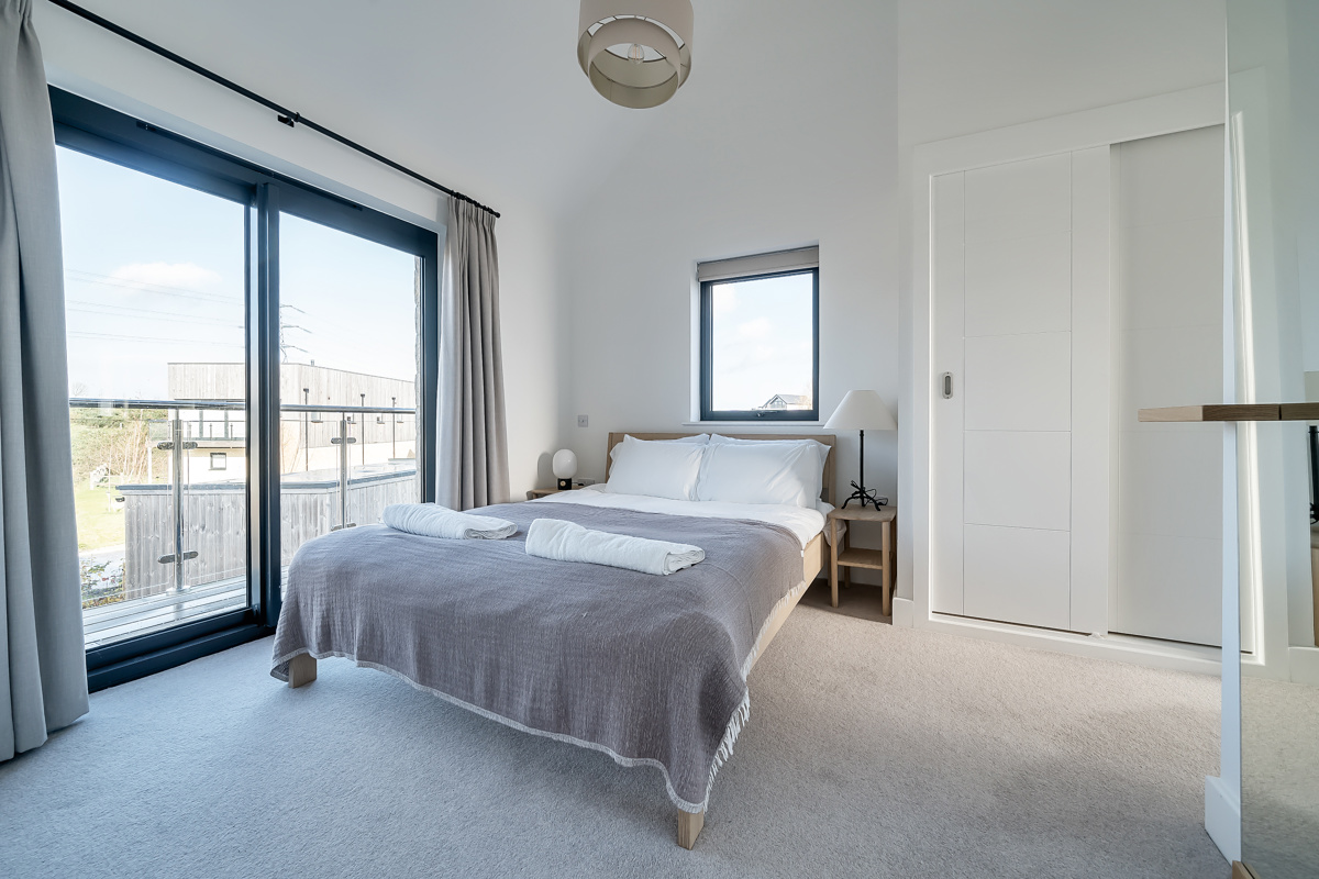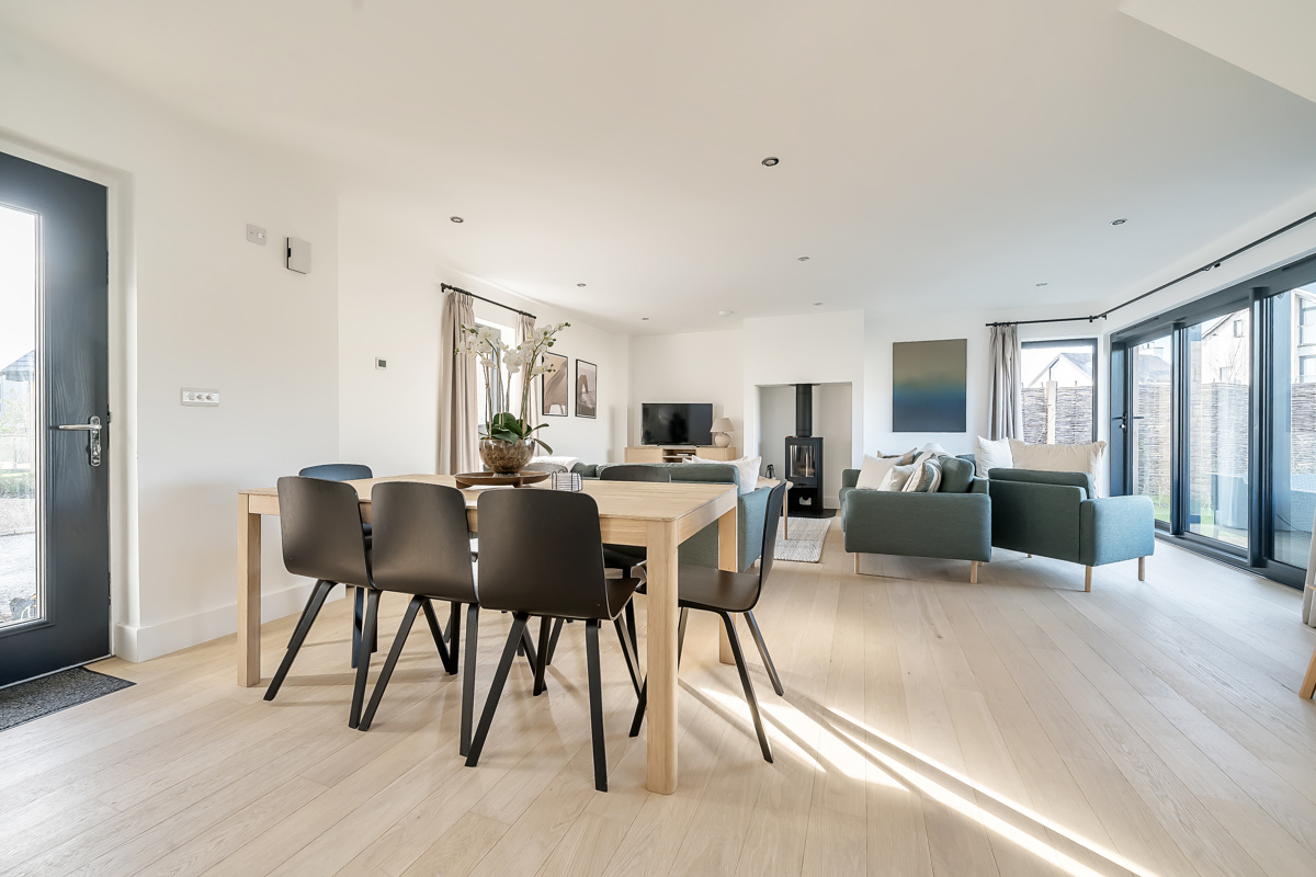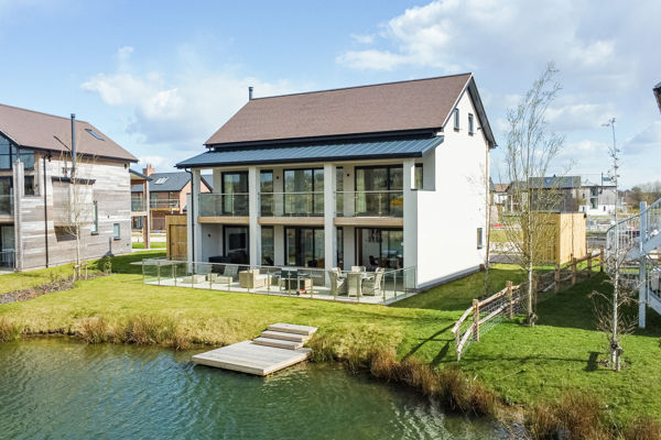 The ground floor incorporates a modern, open-plan kitchen with bar seating providing the perfect link to both the dining and living areas. Making evenings cosy couldn't be easier with the log fire as a central feature of the living room. The sleek and modern kitchen area has a range of built-in appliances including integrated hob with extractor while the dining area provides ample space for eight diners. Floor-to-ceiling sliding doors lead onto the rear full-width deck and west-facing garden space. The perfect place to relax and unwind after a busy day exploring the lakes, heathland and all that the Estate has to offer. A downstairs WC with a utility cupboard housing a washer/dryer completes the ground floor accommodation.