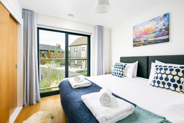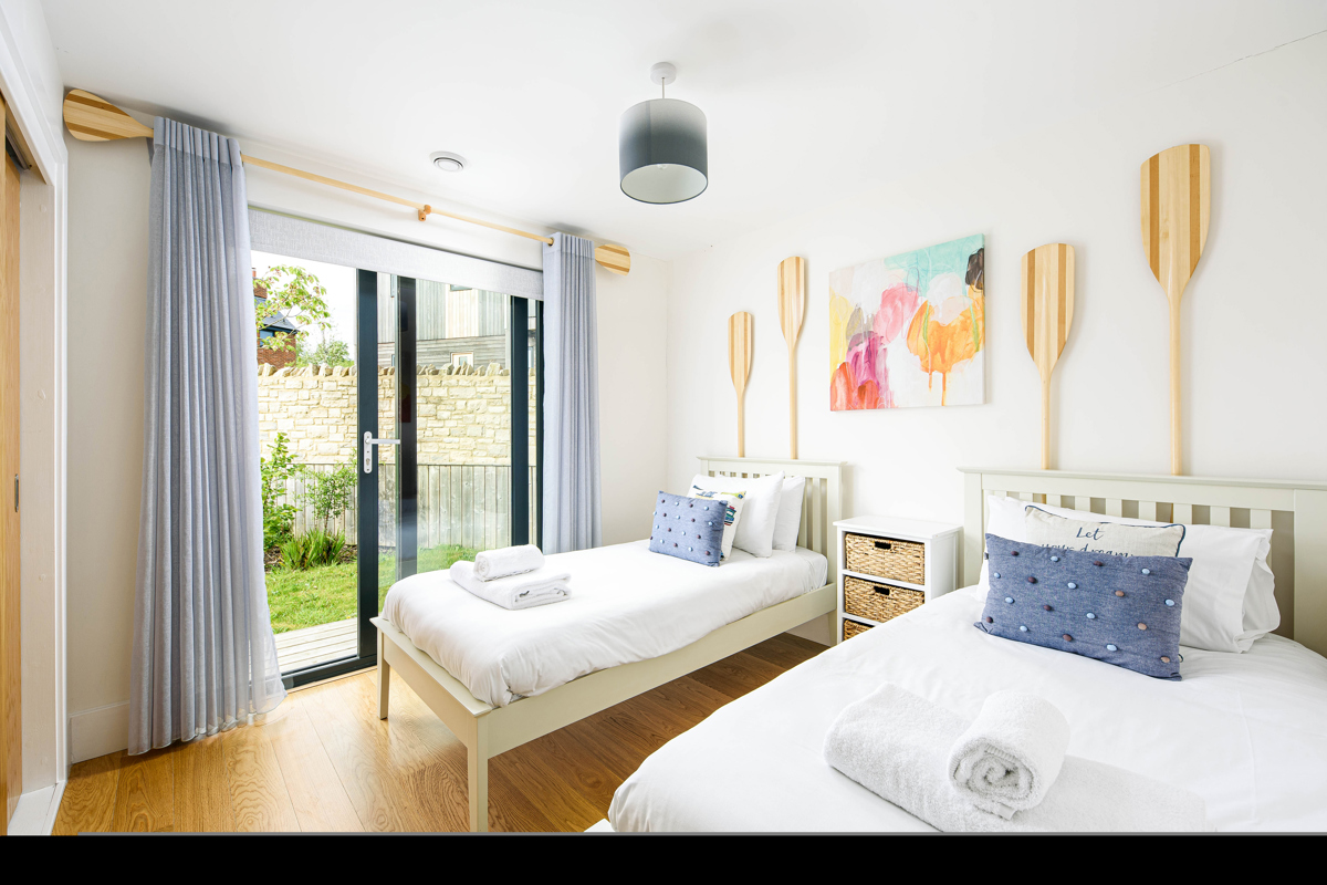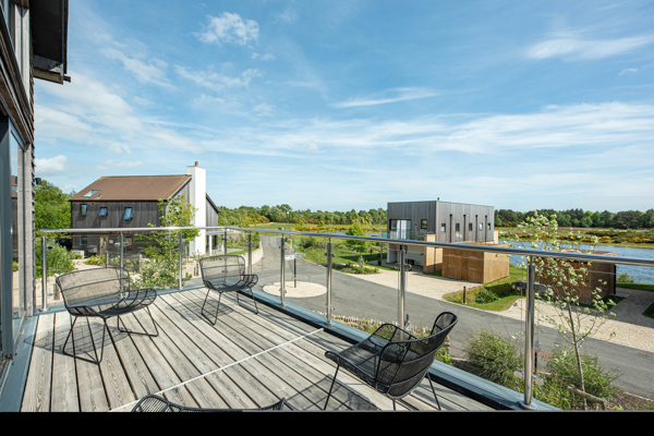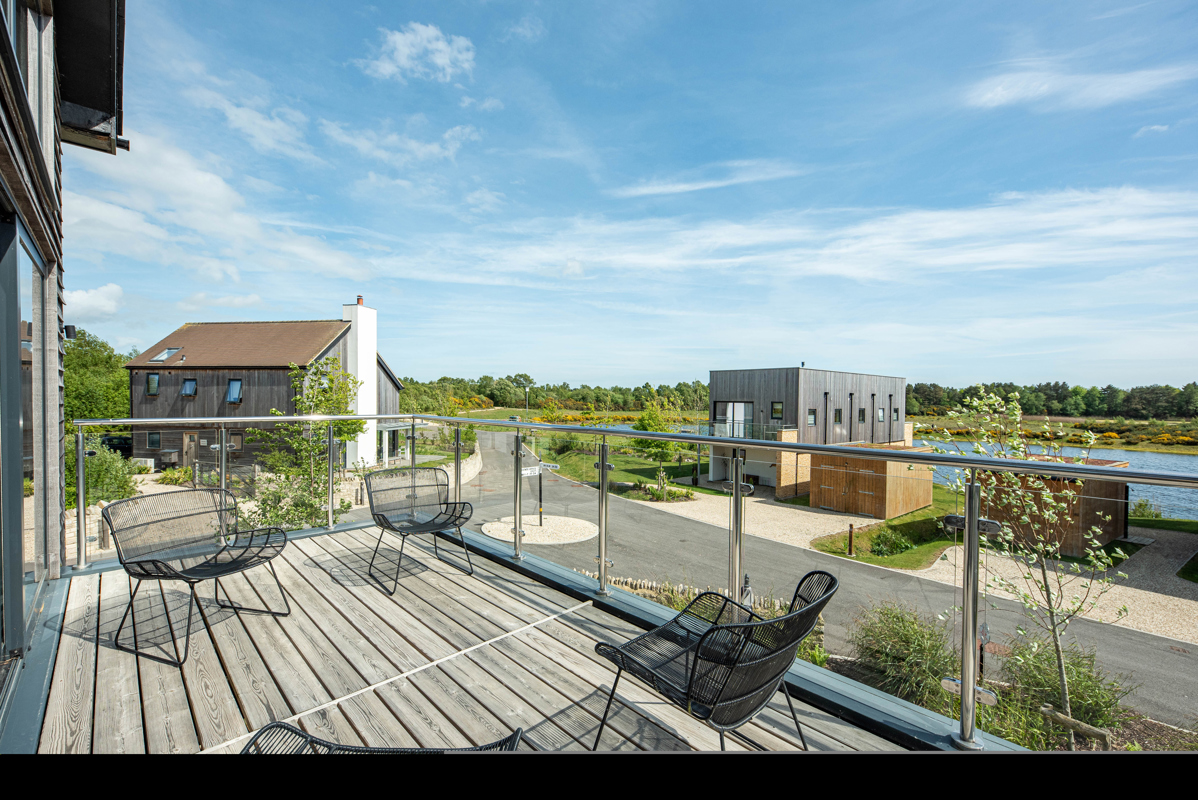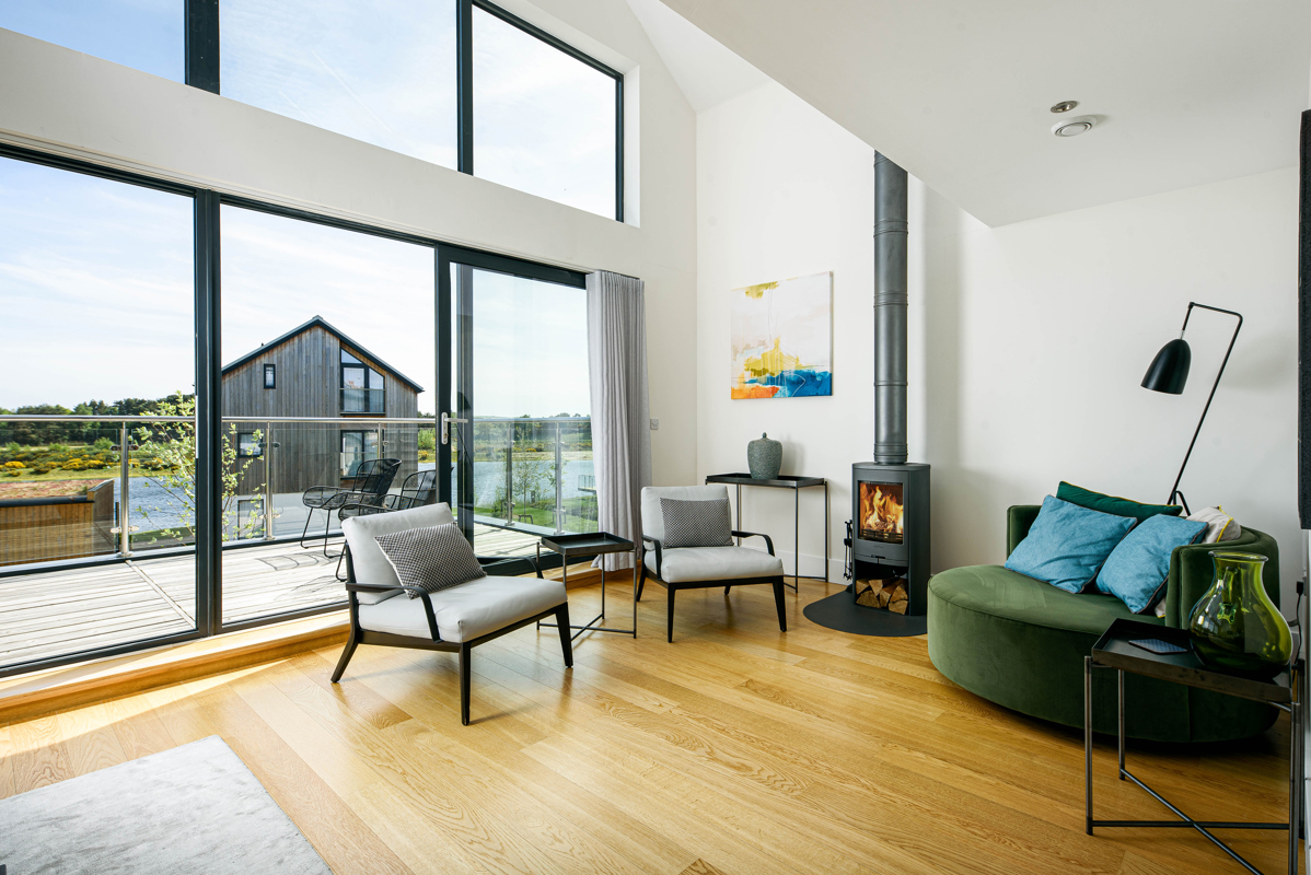 The stunning living area is set on the first floor, featuring floor-to-ceiling windows, a cosy wood-burning stove and access to a large balcony and outdoor seating. There are 2 bedrooms on the ground floor, one twin room with ensuite bathroom and a king room with ensuite shower. There is a small, decked area to the rear of the property with access from sliding doors to both ground floor bedrooms.